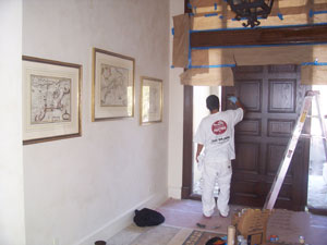 We will cover your floor with drop cloths and apply painter's tape to the areas that will be painted later. For example, tape is applied to stained or wood baseboards. Using painter's tape is important because it won't pull off paint when the tape is removed.
